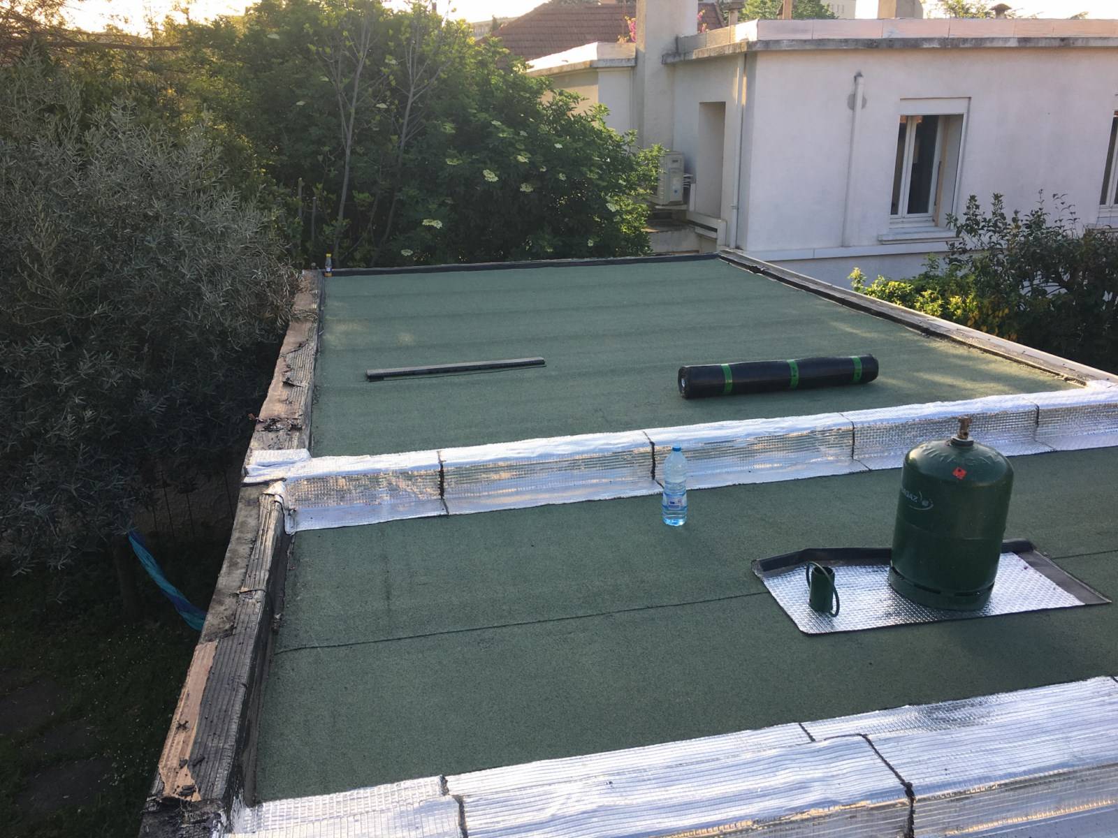 Dans un premier temps nous avons réalisé la dépose de l'étanchéité défectueuse, ensuite nous avons effectué la préparation pour accueillir une nouvelle étanchéité et ainsi rendre totalement