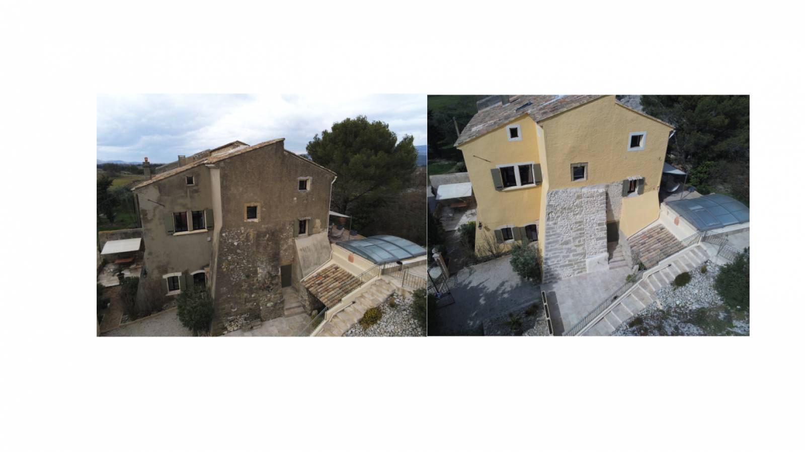 Chantier sur la commune de Senas 13560, ravalement de façade par application d'une peinture spéciale extérieur, rénovation d'un murs ancien en pierre avec décroutage et application d'un enduit au niveau des joints pour faire ressortir les pierres, photos avant après de ce magnifique mas et clients ravis du résultat.